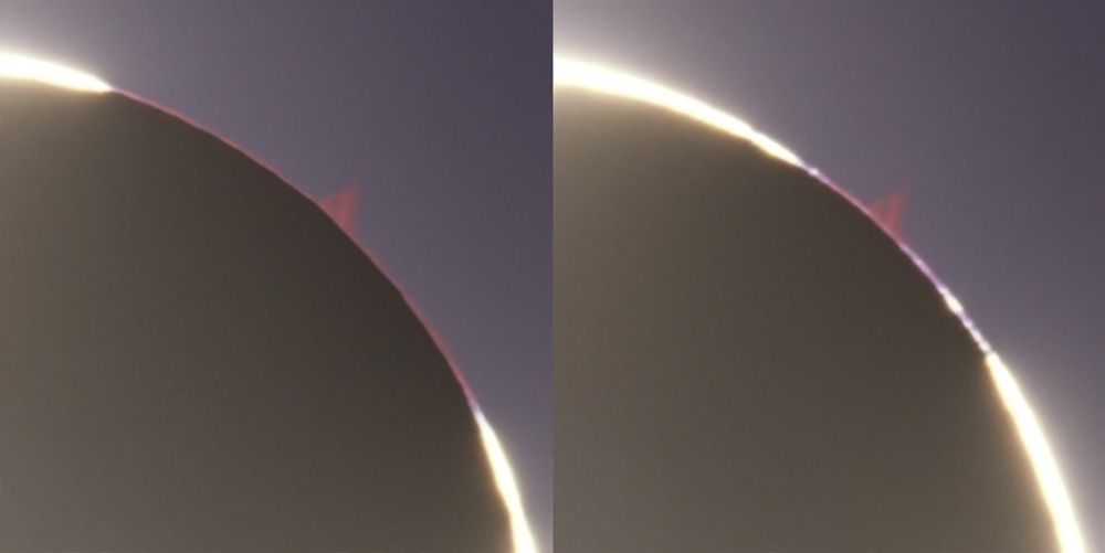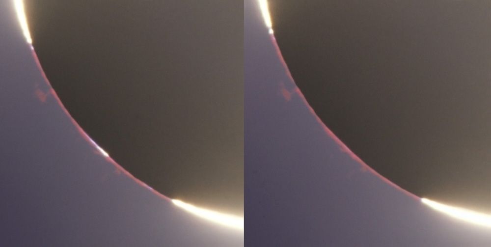 Nur jetzt kann man ohne Hilfsmittel Protuberanzen an der Sonnenoberfläche sehen.